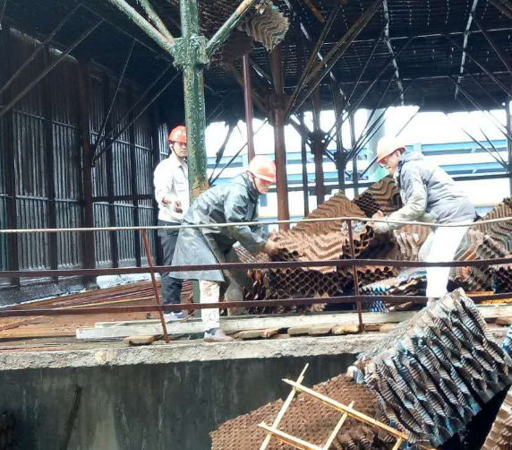 無論自身如何泥水相伴,冷卻塔上下的檢修人員你拆我接,你接我送,緊張有序、團結(jié)一致地進行著大面積的填料拆取、塔桿更換工作。