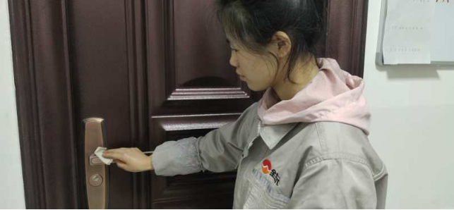 擦拭操作臺(tái)、門(mén)把手,工作的有條不紊。