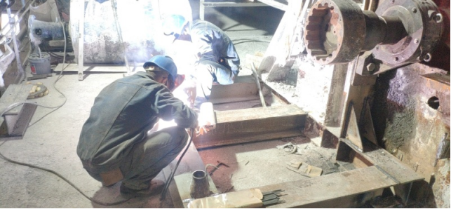 (8)回轉(zhuǎn)窯輪帶擋圈及墊板補焊加固,檢查大齒圈齒面磨損并對齒面打磨修復(fù)(未完成);