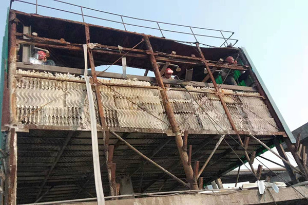 在完成相關(guān)作業(yè)的準(zhǔn)備工作,穿戴好各類防護用品,簽發(fā)了各類票證后,大家就進入到檢修現(xiàn)場。加固冷卻塔前,必須先拆除冷卻塔壁板,清洗冷卻塔填料雜物及易燃易爆物質(zhì)。由于冷卻塔結(jié)構(gòu)腐蝕嚴(yán)重,填料內(nèi)部含易燃易爆物質(zhì)多,所以必須對冷卻塔進行多次沖洗徹底除去易燃易爆物質(zhì)才能進行動火加固作業(yè)。