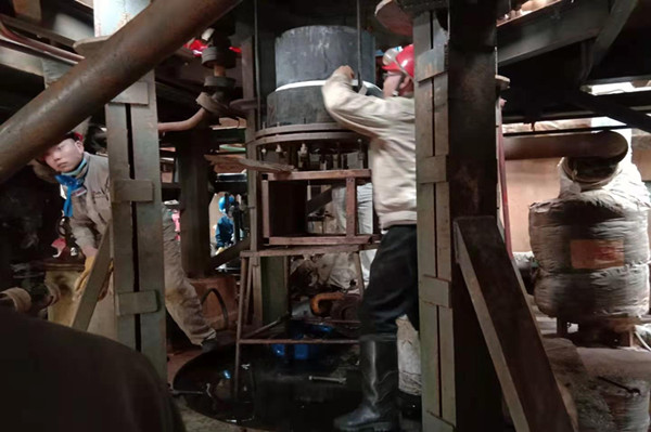 燈頭是蒸汽爐最核心的部件,它就如同蒸汽爐的“心臟”,保證著蒸汽爐的安全平穩(wěn)運(yùn)行。由于燈頭是石英材質(zhì),不能有任何碰撞。有著二十年檢修工作經(jīng)驗(yàn)沈培銀老師傅,像一名“將軍”一樣,指揮著大家拆燈頭,滿身的油污,像軍功章一樣掛在他的胸前。只見(jiàn)他拿來(lái)三根全絲螺桿,均勻地固定在燈頭支座上,隨著三只螺母的松動(dòng),燈頭就開始慢慢地向下移動(dòng),為了保證燈頭的平穩(wěn)下落,三個(gè)人必須同時(shí)松動(dòng)螺母,這需要高度默契地配合。 沈培銀老師傅不緊不慢地松動(dòng)著螺母,并時(shí)刻提醒著其他兩個(gè)人的進(jìn)度。汗水早已濕透了三人的衣服,裹挾著污漬的汗水不停地順著他們的臉頰滴落。愛(ài)開玩笑的同事,不失時(shí)機(jī)地說(shuō)個(gè)笑話,逗得大家哈哈大笑,身上的疲憊感頓時(shí)消減幾分。