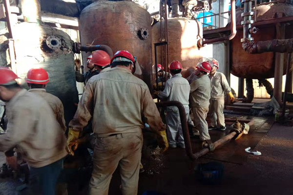 在完成了相關(guān)作業(yè)的準備工作,參與檢修人員穿戴好各類防護用品,辦理各類票證后,大家就進入到檢修現(xiàn)場。更換再沸器設(shè)備前,必須先排盡設(shè)備內(nèi)的氯化鈣,由于連接管線不能徹底排盡設(shè)備管線內(nèi)物料,只能通過人工接力的方式,將管線剩余的氯化鈣一桶一桶的接出,并迅速的倒入回收貯罐內(nèi)。整個過程必須密切協(xié)作,否則就會造成氯化鈣的大量外溢,在環(huán)保壓力如此大的今天,是絕對不容許的。經(jīng)過近一個小時的努力,設(shè)備管線內(nèi)的氯化鈣終于排放干凈。此時每個人的臉上都浸滿了汗水,這也是檢修人員最美麗的時刻。