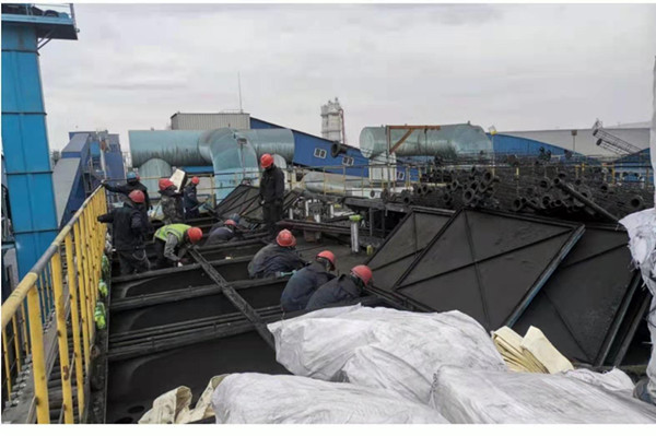 “兵分兩路,烈日前行”。5月22日早晨8:30,30多人開始在除塵系統(tǒng)頂部開始舊布袋和袋籠的拆除工作!耙粋(gè)布袋長(zhǎng)4.2米,全部堆到這兒,對(duì)平臺(tái)上的作業(yè)人員很不安全,我們還是把布袋疊好,放在大袋子中,這樣現(xiàn)場(chǎng)就不亂了!睅酌毠ぜ皶r(shí)規(guī)整舊布袋。