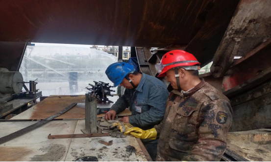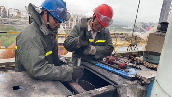 聽,現(xiàn)場鐵錘叮當,看焊花四濺,一幕幕忙碌的身影,無不令人感動不已......剛順著樓梯趴下,又要順著樓梯爬上,總經(jīng)理吳紅衛(wèi)同志既是現(xiàn)場的指揮員、進度的監(jiān)督員,又是現(xiàn)場的協(xié)調(diào)員,哪里需要怎樣干,他便第一時間提出自己的見解。映入眼簾的是他總是第一時間到達現(xiàn)場,最后一個離開,一身勞保衣服一天下來總要背著一層土。正是這種帶動,全體維修人為了不窩工,不影響進度,午飯總是簡單的填飽肚子繼續(xù)干,個個干勁十足,衣服早已被油污和灰塵、汗水摻雜浸濕,黑乎乎的臉蛋也分不清誰是誰。