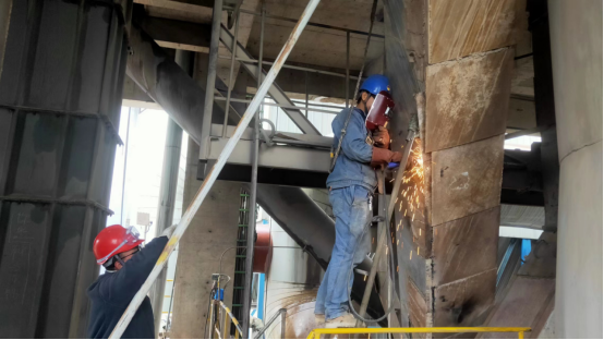 選粉機進行補焊風格輪,由于作業(yè)空間狹小,不好展開工作,他們克服困難,在保證安全第一的情況下順利完成檢修工作任務。