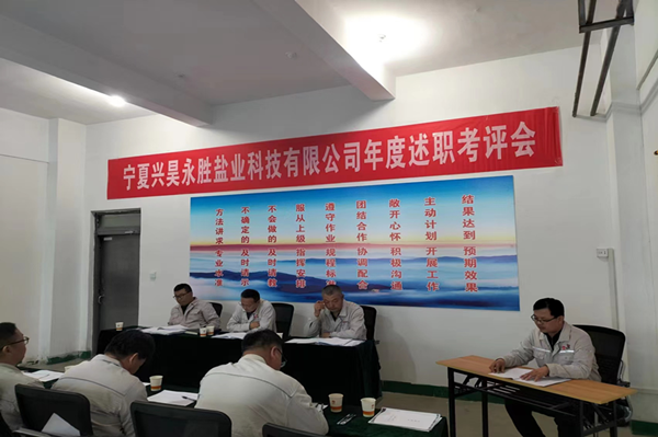2023年11月14日,寧夏興昊永勝鹽業(yè)科技有限公司組織召開管理人員年度述職考評(píng)會(huì)議。職能科室負(fù)責(zé)人、專業(yè)技術(shù)人員、生產(chǎn)調(diào)度和各裝置正副裝置長等19名管理人員進(jìn)行述職,33名職工代表列席會(huì)議。