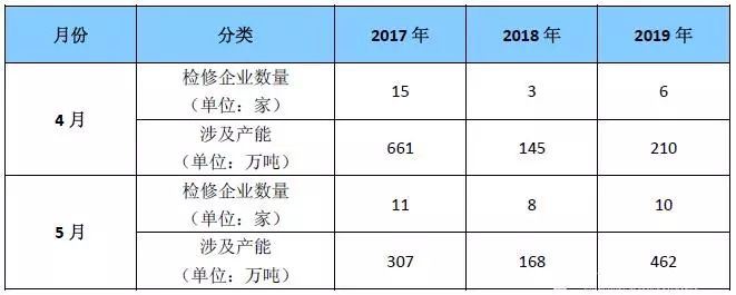 表1 2017-2019年4-5月燒堿檢修廠家及涉及產(chǎn)能統(tǒng)計(jì)表