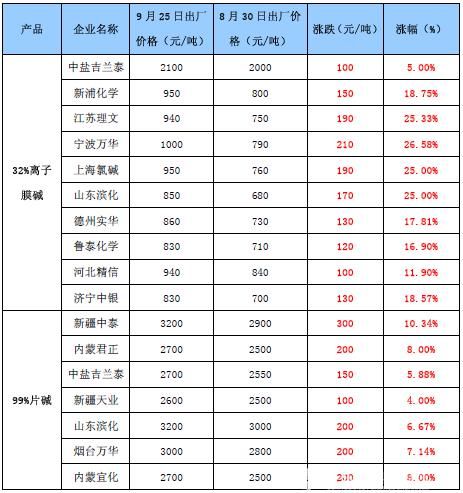 從表1來看,國內主要燒堿廠家紛紛上調出廠報價,其中中鹽吉蘭泰等廠家曾在一個交易日內兩度上調報價,心態(tài)強烈可見一斑。在開工基本穩(wěn)定、市場供應充足的背景下,廠家之所以迅猛上調出廠報價,主要是受江蘇危化品禁運消息影響。自9月20日起,江蘇地區(qū)禁運危險品,在無法就地處理燒堿副產(chǎn)品液氯的情況下,當?shù)夭糠譄龎A企業(yè)只能選擇降負荷或停工,燒堿供應預期大幅減少。因此,江浙一帶燒堿企業(yè)惜售心態(tài)強烈,自9月初開始,大幅輪番上調出廠報價,其中漲幅最大的要數(shù)寧波萬華。