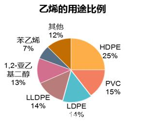 聚乙烯(簡稱“PE”)以及聚氯乙烯(簡稱“PVC”),都與乙烯有相當(dāng)密切的聯(lián)系。乙烯源于液化天然氣、液化石油氣、輕柴油、重油或原油等經(jīng)裂解產(chǎn)生的裂解氣中分出,亦可以從焦?fàn)t煤氣中產(chǎn)生,還可以從乙醇脫水中獲得。在全球聚乙烯制作方法中,其中44%為原油產(chǎn)出石腦油制乙烯,43%為天然氣產(chǎn)出乙烷氣制乙烯,13%為煤炭/天然氣產(chǎn)出甲醇制乙烯。在乙烯的所有用途中,PE和PVC對乙烯的使用量最大,分別占比53%和15%。
