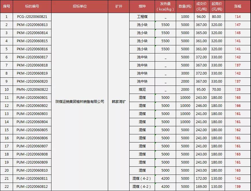 昨日,榆林地區(qū)陜煤旗下六大煤礦最新競價(jià)結(jié)果公布,成交價(jià)最高漲幅達(dá)到32元/噸。