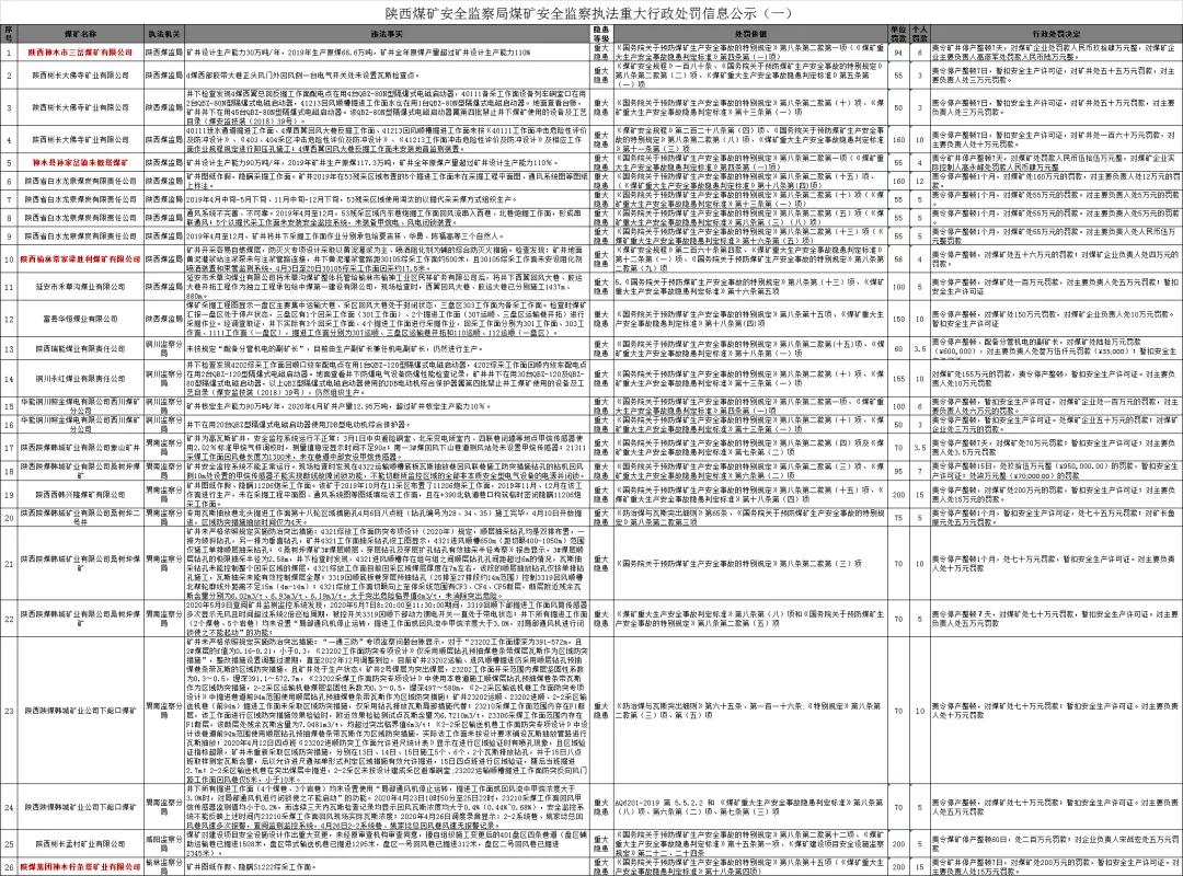 6月10日,陜西煤礦安全監(jiān)察局官網(wǎng)發(fā)布了《關(guān)于2020年煤礦安全監(jiān)察執(zhí)法重大行政處罰信息公示(一)》。