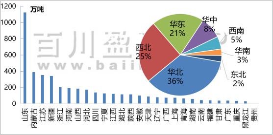 2020年中國(guó)燒堿產(chǎn)能分布情況來(lái)看,山東燒堿仍然排名第一,山東燒堿產(chǎn)能為1125萬(wàn)噸,內(nèi)蒙古燒堿產(chǎn)能為388萬(wàn)噸,江蘇燒堿產(chǎn)能為354.5萬(wàn)噸,新疆燒堿產(chǎn)能為341.5萬(wàn)噸, 浙江燒堿產(chǎn)能為203萬(wàn)噸。目前我國(guó)除貴州、西藏、北京、吉林、海南地區(qū)(特別行政區(qū)及臺(tái)灣地區(qū)除外)基本實(shí)現(xiàn)氯堿產(chǎn)能覆蓋。