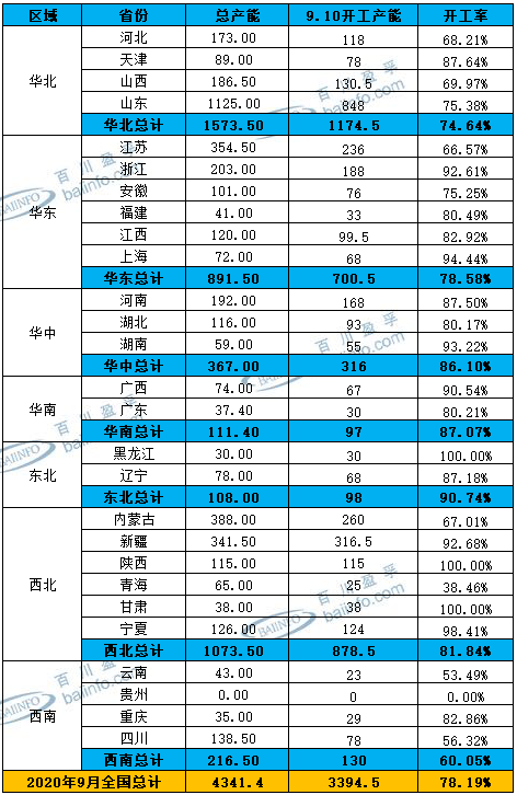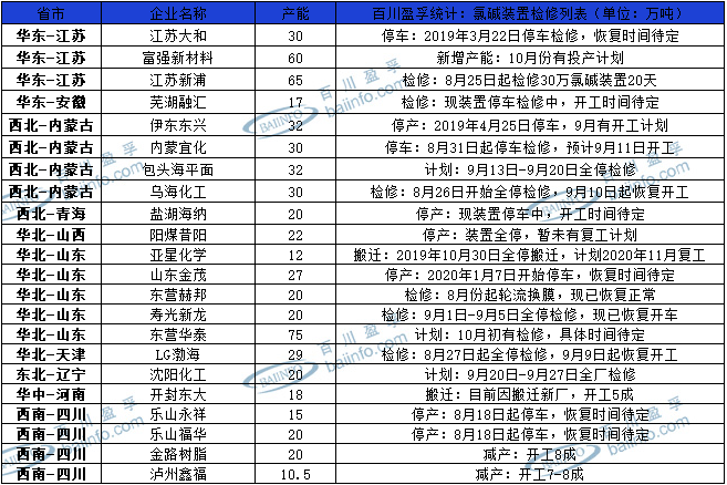 2020年9月份涉及檢修的廠家較少,整體開(kāi)工變化不大,主要因山東、新疆、內(nèi)蒙、河北等氯堿大省氯堿企業(yè)基本上半年完成檢修工作。