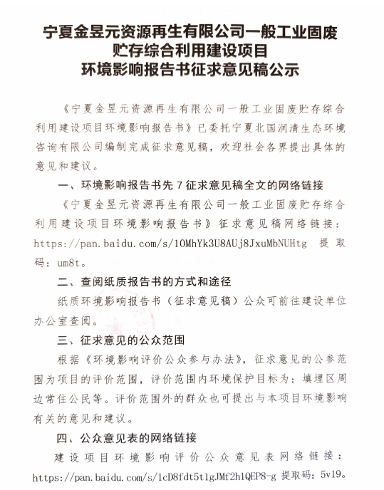 寧夏金昱元資源再生有限公司一般工業(yè)固廢貯存綜合利用建設(shè)項(xiàng)目征求意見稿公示